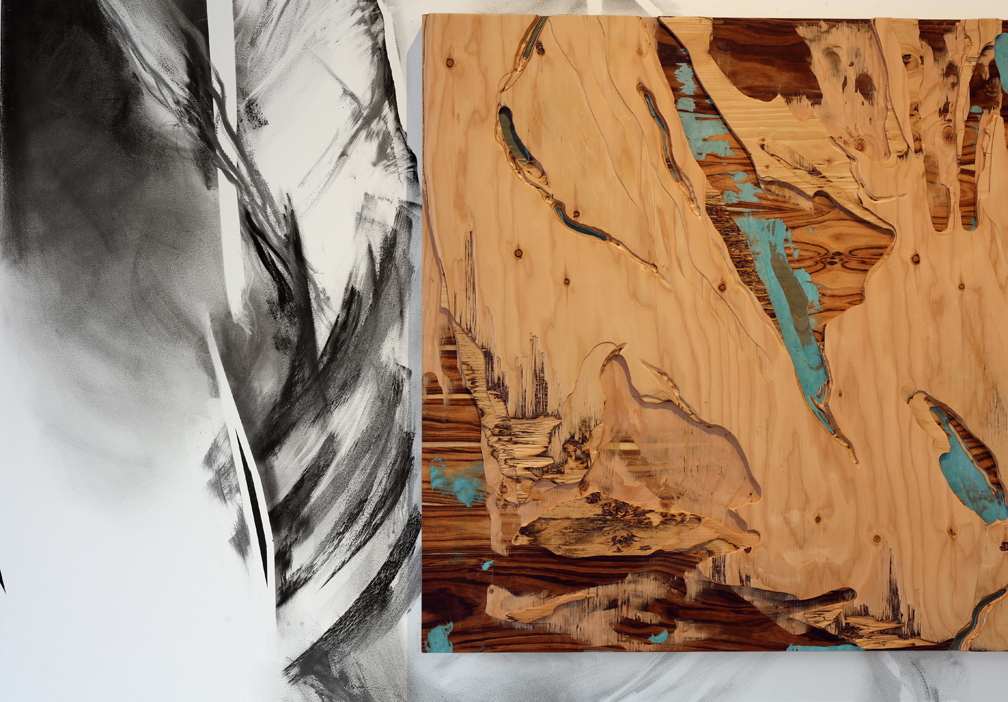 Project (detail), 2017 carved custom-made plywood of tinted & exotic veneers, graphite & charcoal on wall