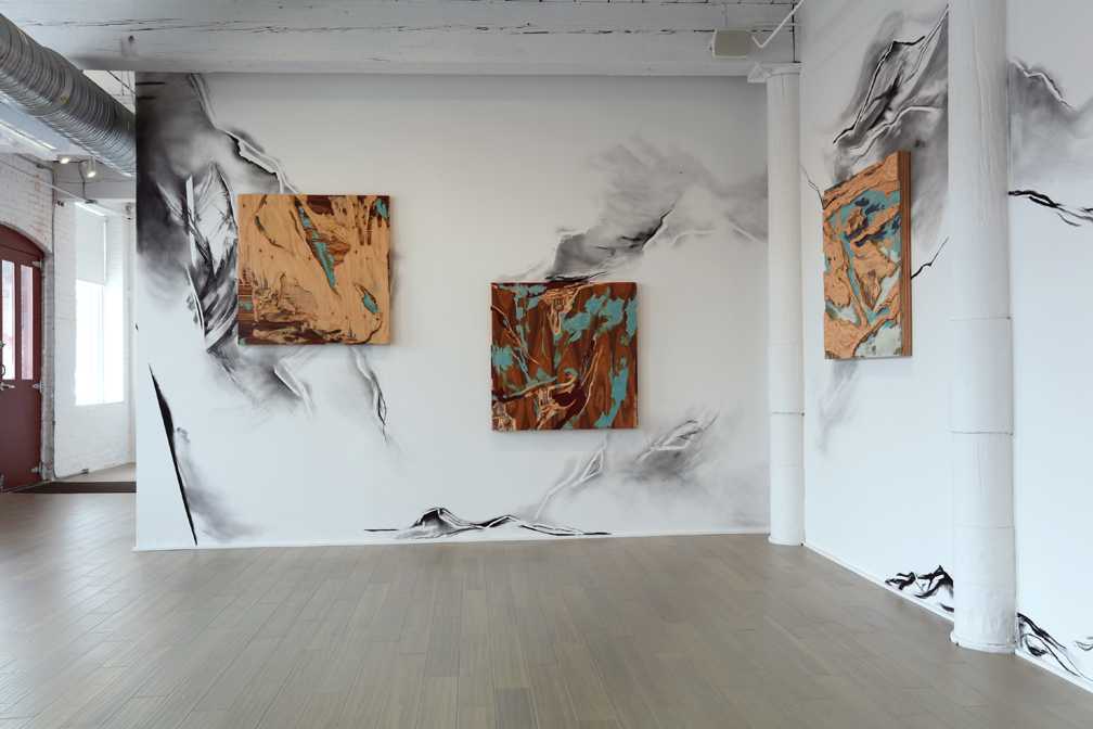 Project, 2017 carved custom-made plywood of tinted & exotic veneers, graphite & charcoal on wall