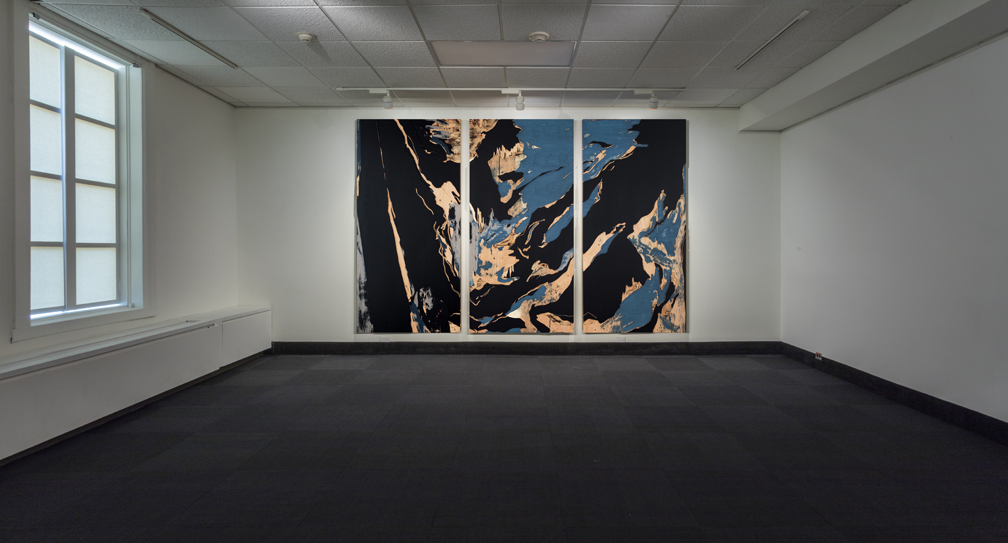 Oceanic Legends, 2017 Triptych carved custom-made plywood of tinted veneers 96” x 156” / 244 x 396 cm