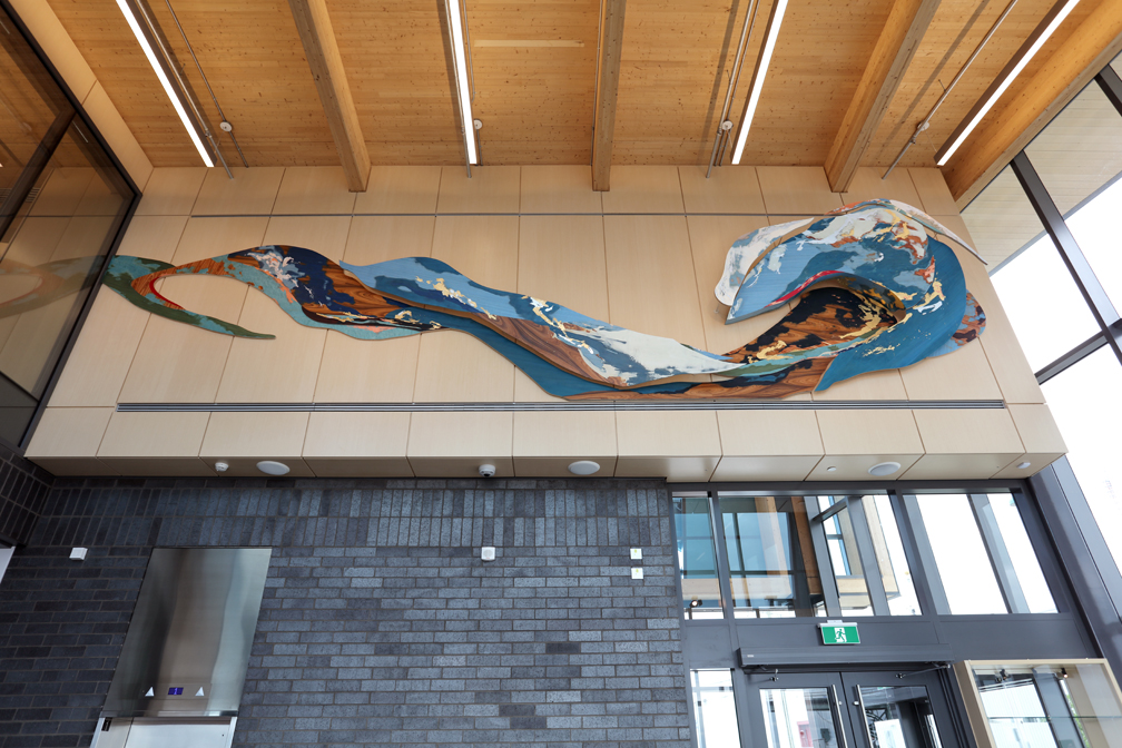 Affluents, 2019 Sorel-Tracy Marine Terminal plywood, tinted and natural veneers with gold, copper, aluminum leaves and stainless steel 387" x 95" x 24" / 983 x 241 x 61 cm