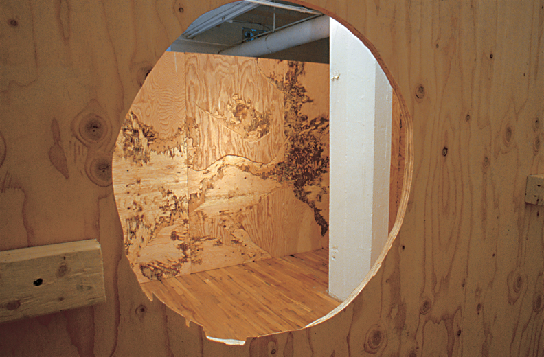 Cross-ply, 2000 porthole view carved plywood 144" x 192" x 96" / 366cm x 488cm x 244cm