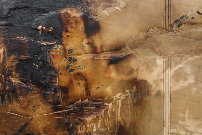 Latent (detail), 2017 carved & burnt white maple plywood, with bronze leaf & lamination
