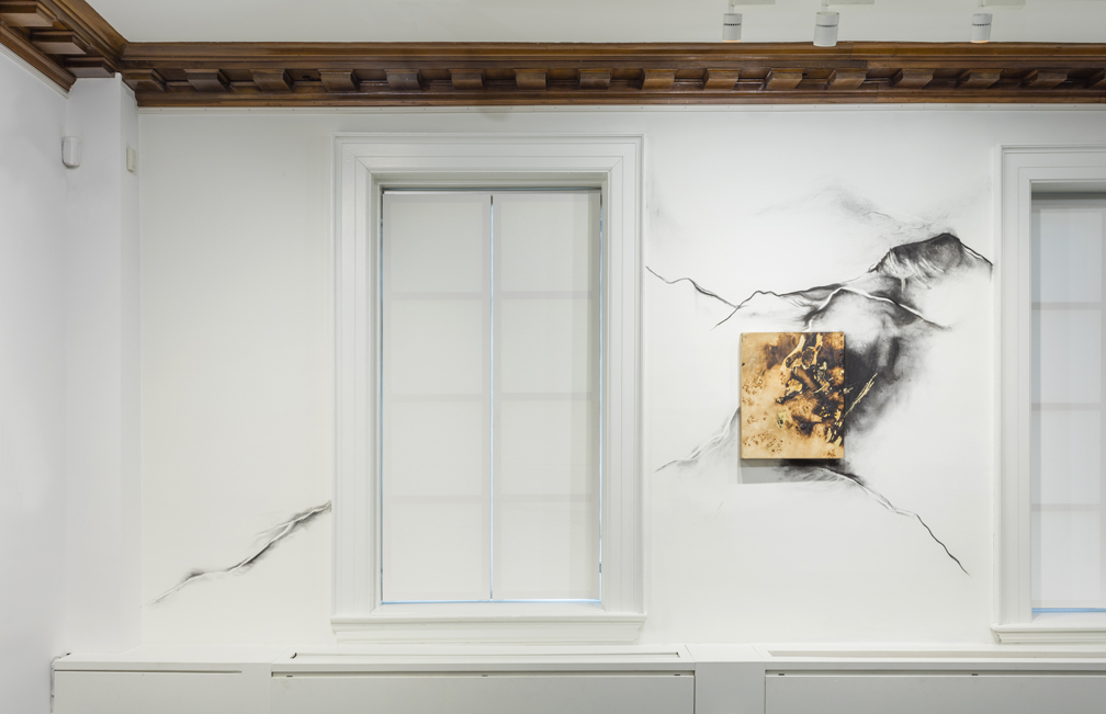Les artères terrestres...dessin éphémère, 2017 bas-reliefs brulés de contreplaqué avec placages et feuille d’or, graphite, fusain et feuille d'or sur mur 132” x 420” / 335 x 1067 cm