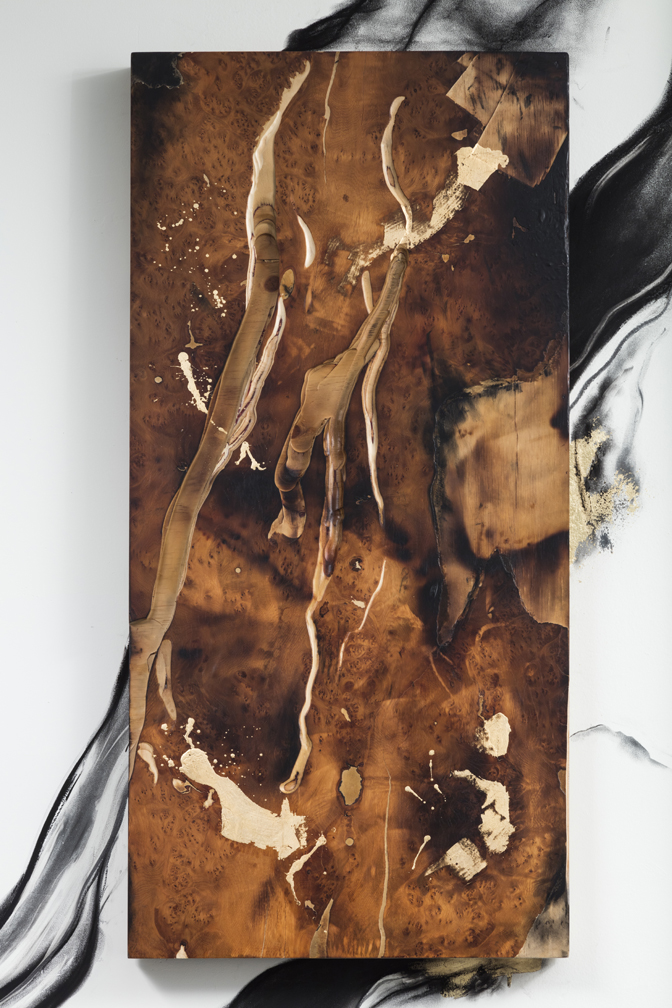 Les artères terrestres...dessin éphémère (détail), 2017 bas-reliefs brulés de contreplaqué avec placages et feuille d’or, graphite, fusain et feuille d'or sur mur