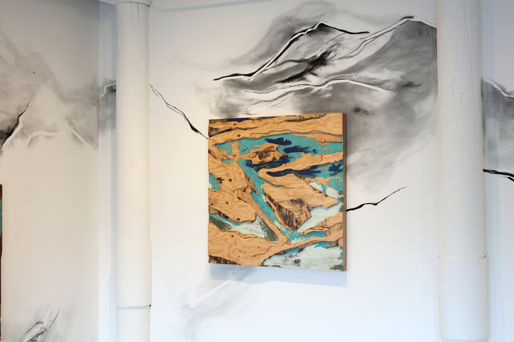 Project (détail), 2017 bas-relief de contreplaqué de placages teints, graphite, poudre de graphite et fusain sur mur