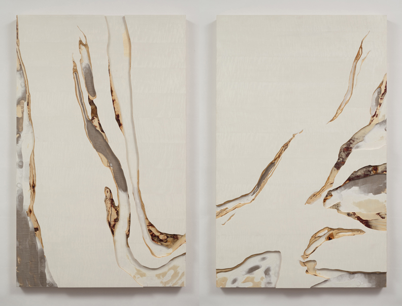 La dentelle du temps, 2015 bas-relief de contreplaqué de placages teints 58” x 36” / 147 x 91 cm chaque panneau