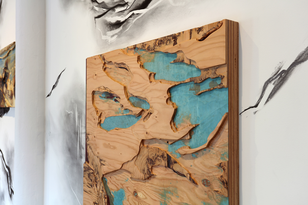 Project (detail), 2017 carved custom-made plywood of tinted veneers, graphite & charcoal on wall