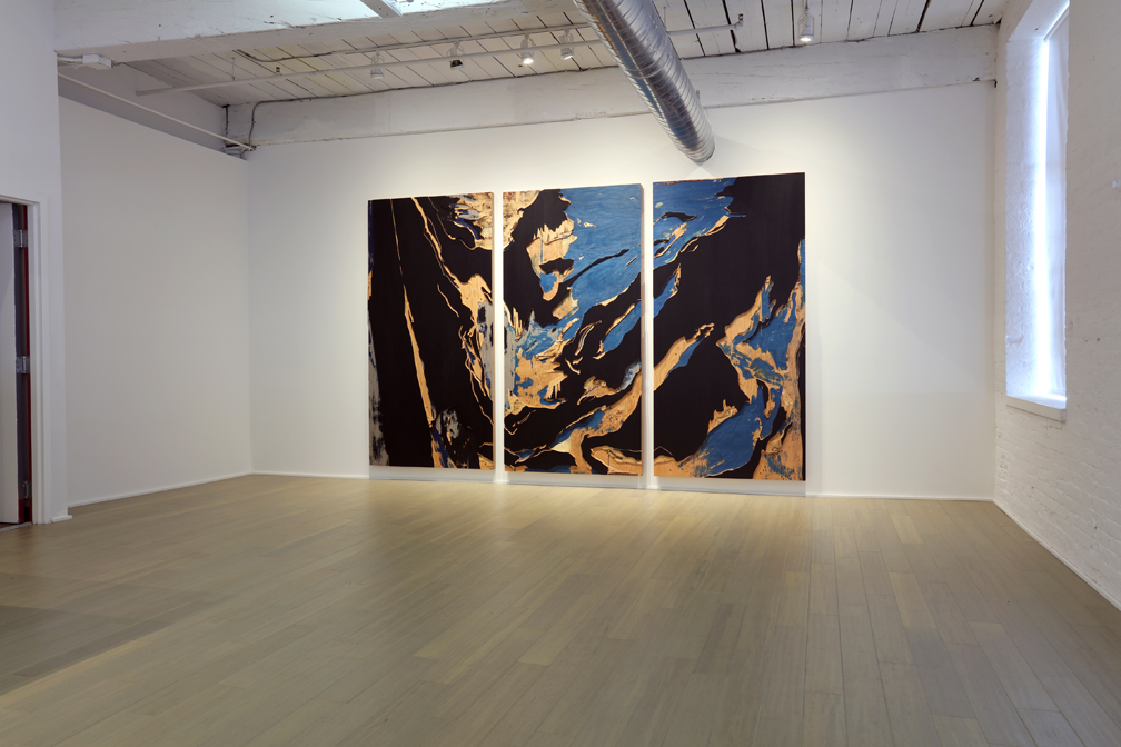 Oceanic Legends, 2017 Triptych carved custom-made plywood of tinted veneers 96” x 156” / 244 x 396 cm