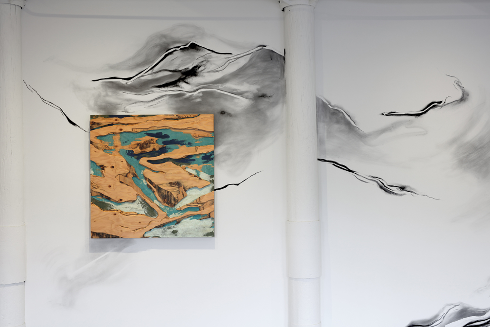 Project (detail), 2017 carved custom-made plywood of tinted veneers, graphite & charcoal on wall