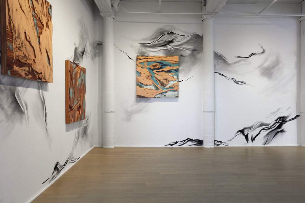 Project, 2017 carved custom-made plywood of tinted & exotic veneers, graphite & charcoal on wall