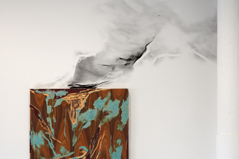 Project (detail), 2017 carved custom plywood of tinted & exotic veneers, graphite & charcoal on wall