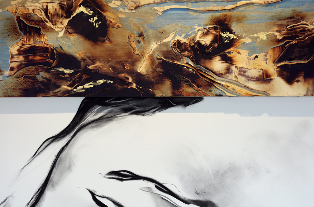 Project (detail), 2017 carved burnt custom plywood of tinted veneers & gold leaf, graphite & charcoal on wall