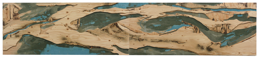 Isles, rhythms & currents, 2016 carved custom plywood of tinted veneers 30” x 144” / 76 x 366 cm