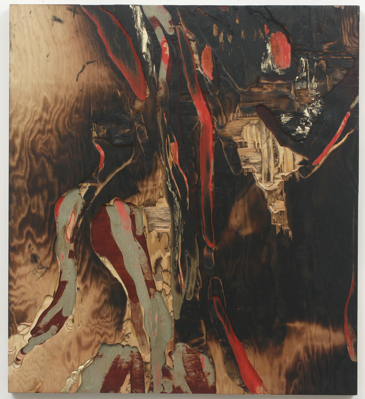 Terrestrial Fugue II, 2016 burnt & carved custom plywood of tinted & exotic veneers with gold leaf 40” x 36” / 102 x 91 cm