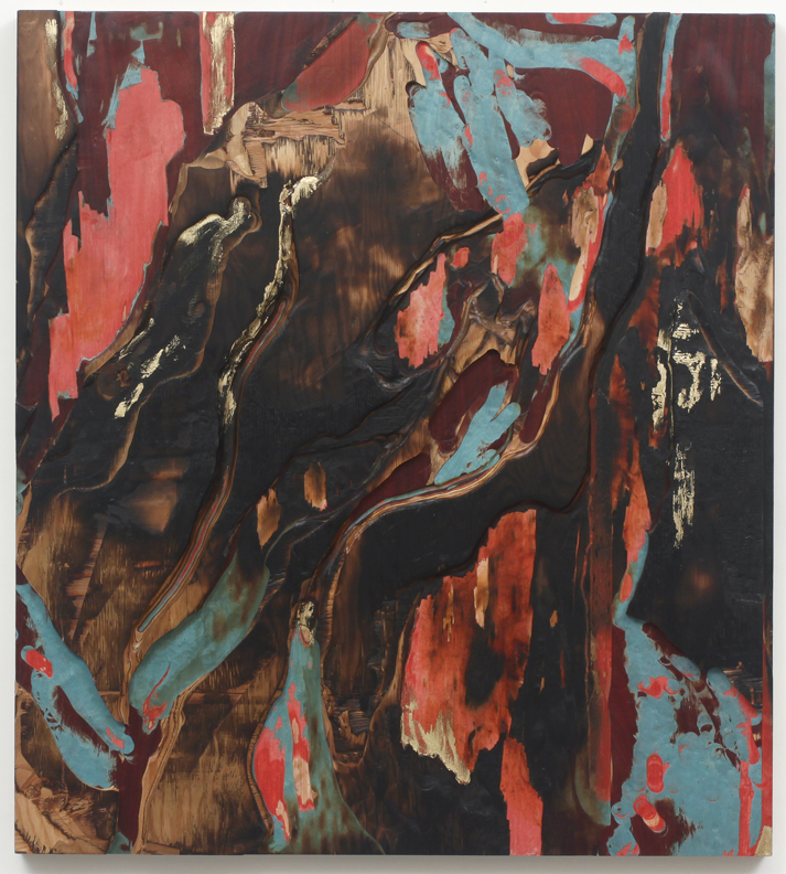 Terrestrial Fugue V, 2016 burnt & carved custom plywood of tinted & exotic veneers with gold leaf 40” x 36” / 102 x 91 cm