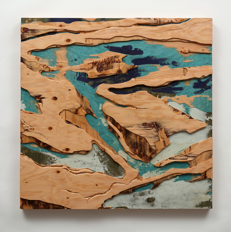 Across land & sea II, 2017 carved custom plywood of tinted veneers 40” x 40” / 101.6 x 101.6 cm