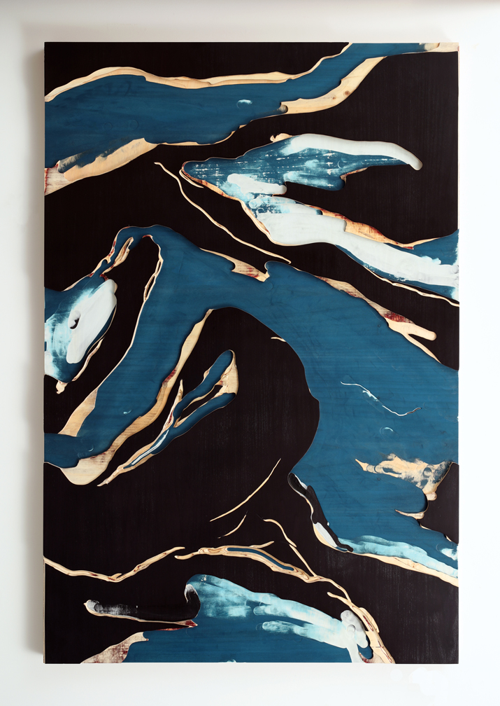 Moving across lands & seas, 2018 carved custom plywood of tinted veneers 72” x 48” / 183 x 122 cm