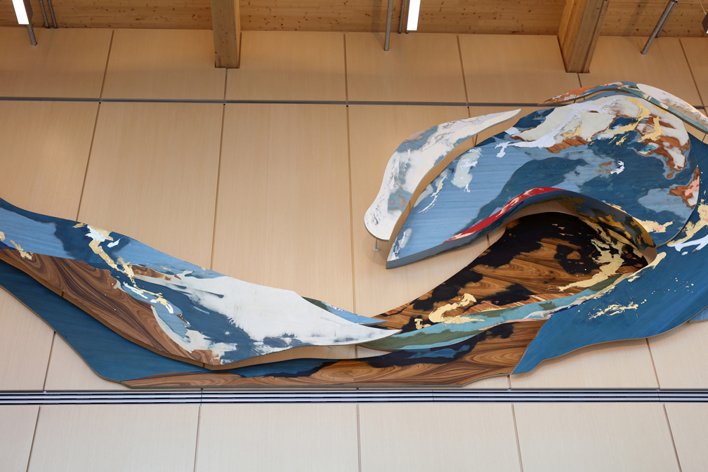 Affluents (détail), 2019 contreplaqué, placages teints et naturels avec feuille d'or, d'aluminium, de cuivre et acier inoxydable