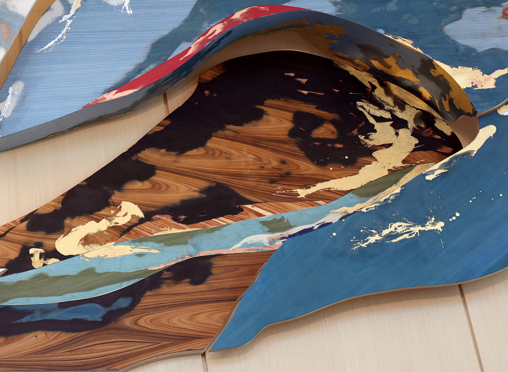 Affluents (détail), 2019 contreplaqué, placages teints et naturels avec feuille d'or, d'aluminium, de cuivre et acier inoxydable